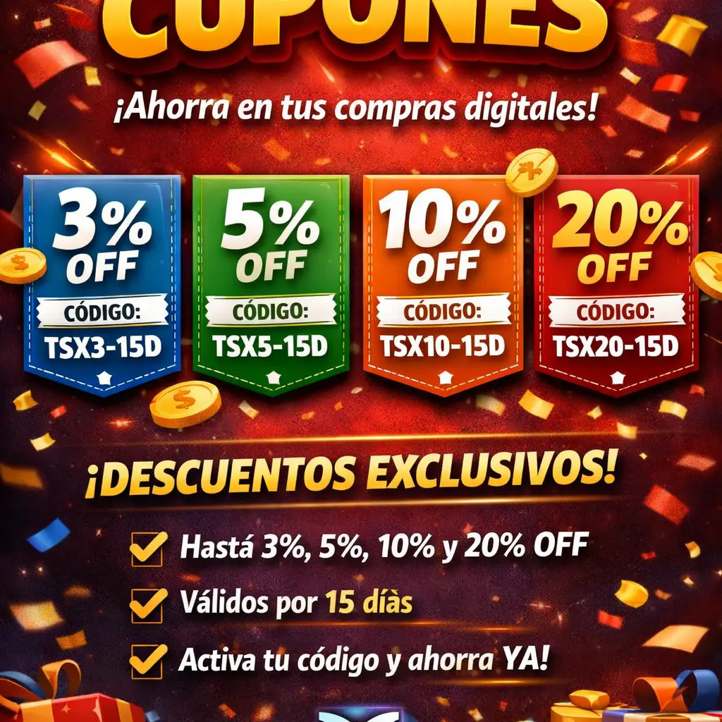 Descubre la forma más rápida de ahorrar en tus compras digitales. En esta categoría encontrarás cupones exclusivos con descuentos de 3%, 5%, 10% y hasta 20%, válidos por tiempo limitado. Activa tu código, aprovecha la promoción y asegura el mejor precio en tus productos favoritos. Ventajas: Descuentos inmediatos en cada compra. Validez flexible: 15 días o 1 mes. Fácil de usar en WhatsApp, Instagram y web. Ideal para clientes frecuentes y revendedores.